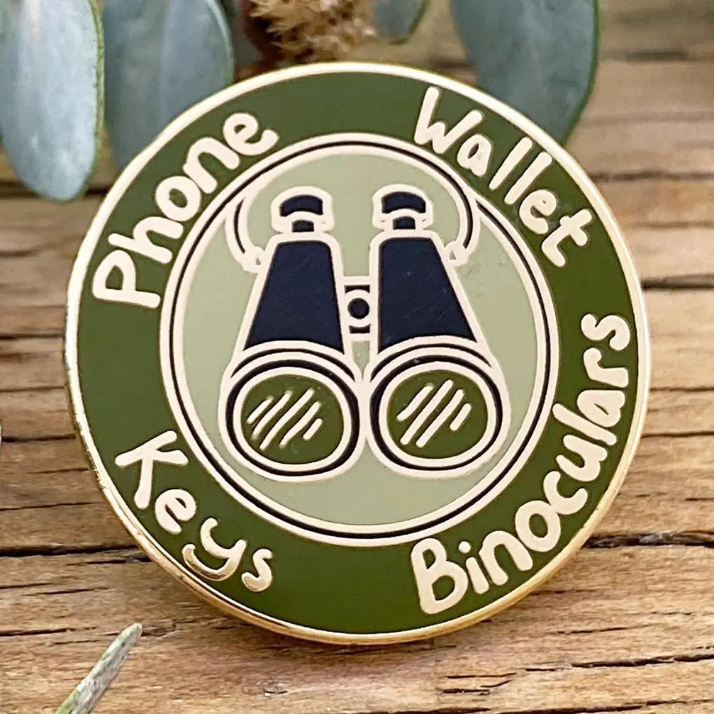 A light-hearted reminder of a birder’s essentials. Measures 3cm x 3cm. Butterfly clasp. Kraft backing card.